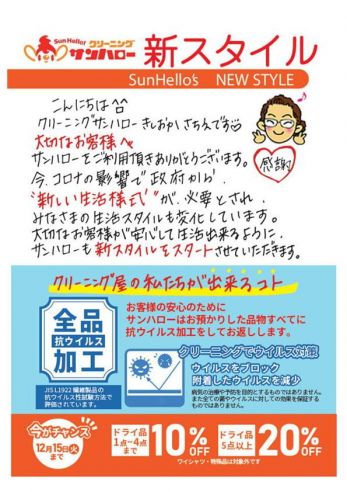 サンハロー新スタイル 抗ウイルス加工お試しキャンペーン 今がチャンス ドライ品1点~4点まで 10%OFF ドライ品5点以上 20%OFF ワイシャツ・特殊品は対象外です
