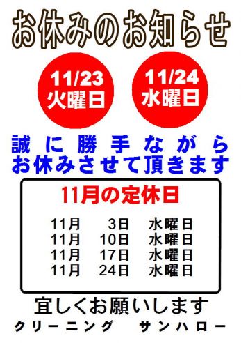 11月 休みのお知らせ